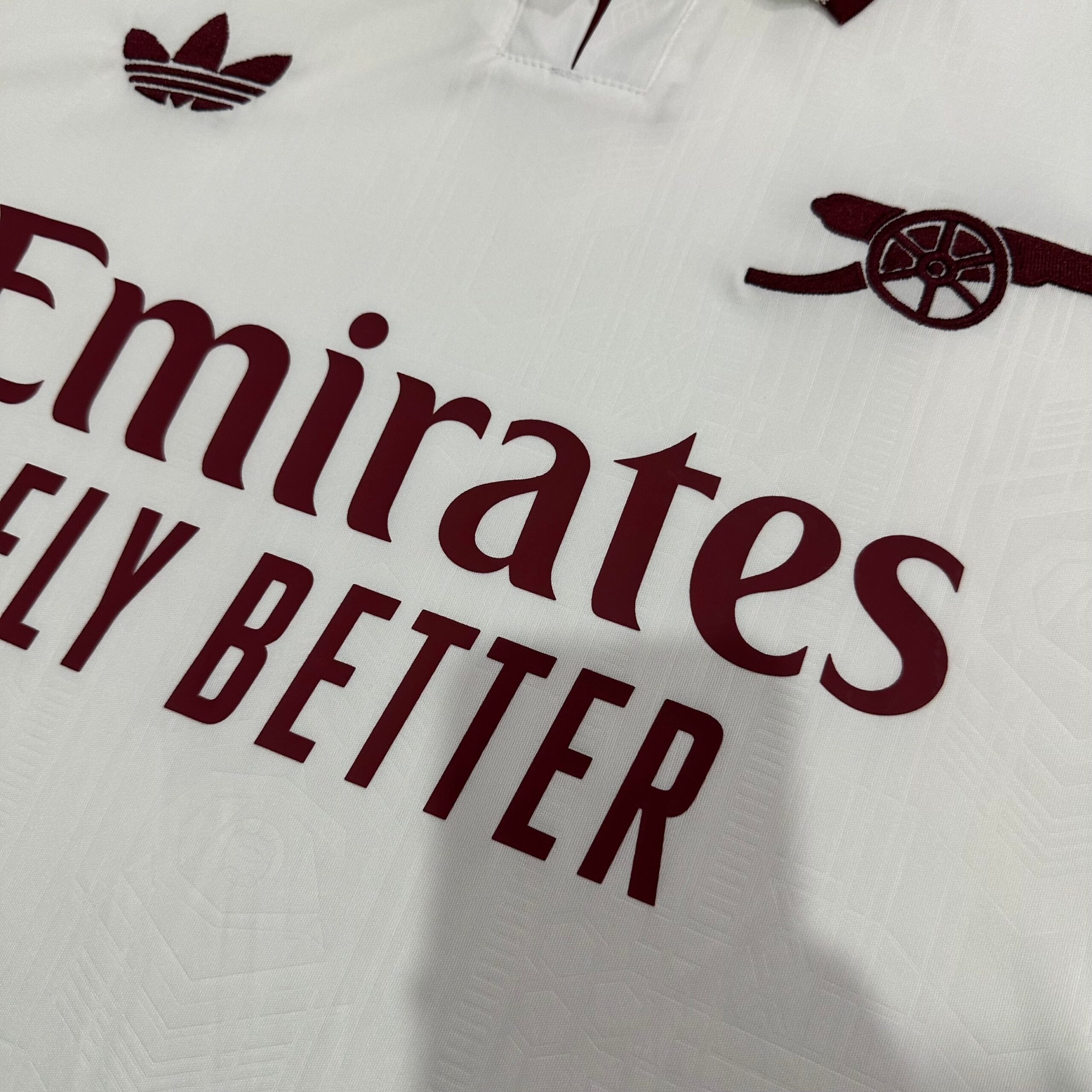 It features a Cloud White base with maroon and gold accents—a tribute to the 2007–09 alternative kit era. The shirt includes a polo collar trimmed in maroon and gold, subtle jacquard textures, and a classy Trefoil logo.